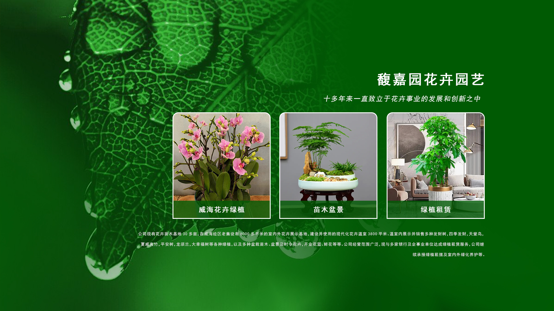 威海市馥嘉園花卉園藝有限公司成立于2009年,十多年來一直致立于花卉事業的發展和創新之中。公司現有花卉苗木基地30多畝,在威海經區老集設有6000多平米的室內外花卉展示基地,建設并使用的現代化花卉溫室3800平米。溫室內展示并銷售多種發財樹,四季發財,天堂鳥,夏威夷竹,平安樹,龍須蘭,大幸福樹等各種綠植,以及多種盆栽苗木、盆景及時令花卉,開業花籃、鮮花等等。公司經營范圍廣泛,現與多家銀行及企事業單位達成綠植租賃服務,公司繼續承接綠植租擺及室內外綠化養護等。